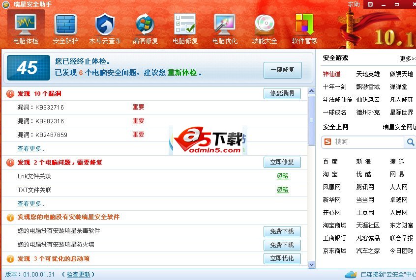 1、全新的”漏洞扫描与设置”,自动修复操作系统及第三方软件漏洞