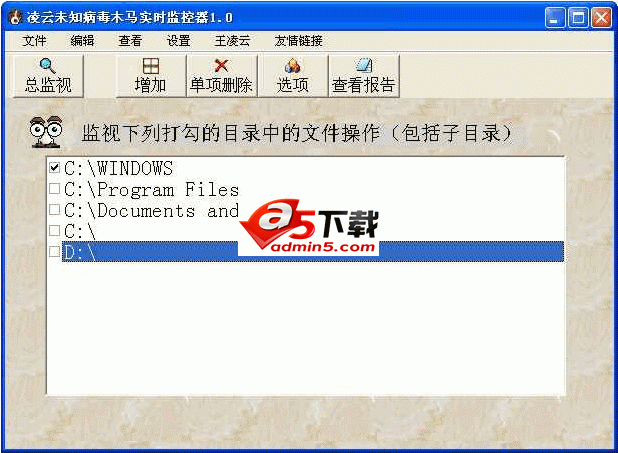 凌云未知病毒木马实时监控器防范病毒、木马,不依赖特征码,跑在病毒木马的前面,开启本软件,自动检测注册表系统自动启动项共14处和两个启动文件夹,并且监视系统文件夹windows中的文件操作(主要是文件创建、修改,并且包括子目录),如有文件创建,尤其是exe文件被创建,立刻报警并删除刚刚生成的exe文件,不让病毒木马入侵重要文件夹,打造成铜墙铁壁,你也可以自定义监视其他目录,最多128个。