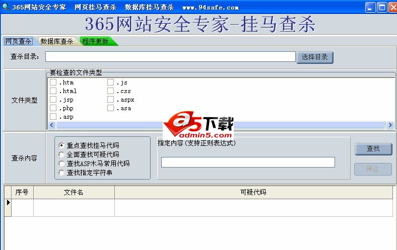 365网站安全专家网页挂马查杀工具是由宜春启航网络科技有限公司(www.ycqhwl.com)开发的一款网站挂马查杀工具,主要可以查杀各类网页文件中包含的网页木马,并支持数据库木马查杀。也可自由指定查杀网页内容.