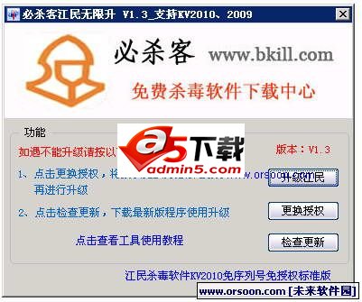 1、同时支持江民KV2010、2009 2、不受授权影响,无需更换授权,即可升级 3、不修改系统和江民杀毒设置及文件 4、绿色免安装,解压即可使用,方便实用 1.3版更新: 1、更新授权,到期时间2011年9月30日 2、去除1.2版中的授权检查项,兼容性更