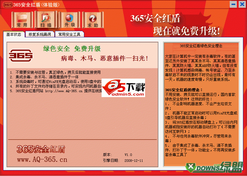 国内首款能直接拷贝运行的纯绿色安全工具软件,集合了病毒、木马、恶意插件查杀于一体,机器严重中毒时可用WinPE启动后杀毒,同时具有漏洞扫描、内网不上互联网也能打补丁、垃圾文件及注册表清理、重复文档整理等安全套件。永久免费提供每日病毒库、补丁库升级! 推荐点评:不用安装、免费升级、拷贝就用!病毒、木马、恶意插件一扫光
