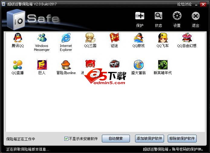 超级巡警”保险箱”是数据安全实验室(www.sucop.com)出品的一款免费账号保护软件。此款软件专为保护电脑内涉密类信息而设计。截至本版本发布,保险箱可完美保护多种主流网络游戏、网银和股票类交易程序、QQ、MSN、淘宝、迅雷等常用应用程序的账号和密码。其使用环境为window2000、winxp、win2003、vista系统。