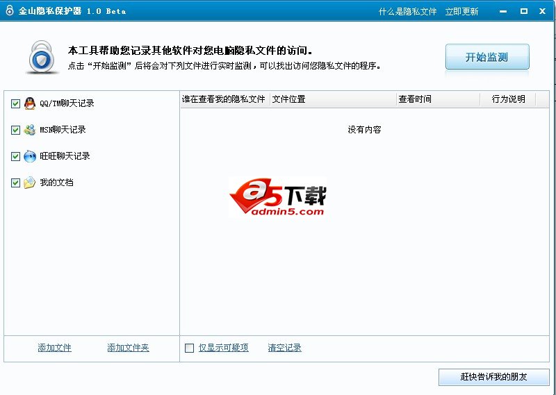 除了网络聊天记录等用户公认的个人隐私外,您还可以自由界定隐私文件的范围,并自行选择需要保护的隐私文件。在隐私文件的定义和监控方面,您有充分的知情权和选择权。