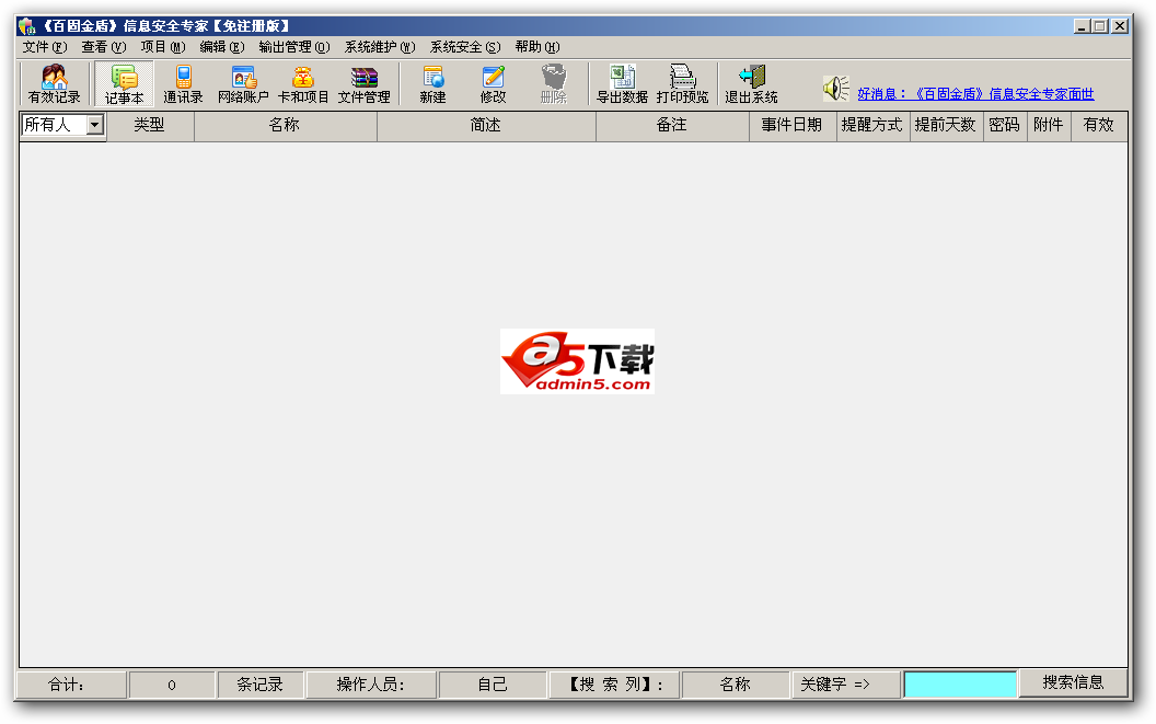 百固金盾包括:记事本管理、通讯录管理、网络帐号管理、银行卡折管理、项目记账管理和文件资料管理等。〖软件默认密码:123456〗