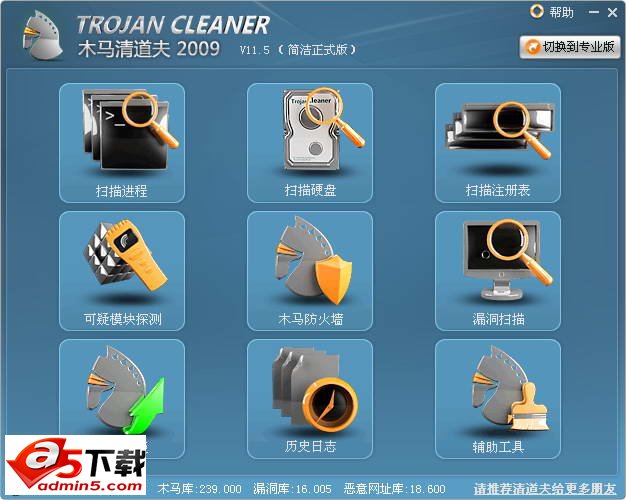 木马清道夫2009,更智能,更安全。全新豪华界面,采用更精致的界面效果和图形化的任务展示。大规模优化内核代码,修正若干功能BUG。初步应用云信任体系的全新技术,来应对如今泛滥的木马病毒,对未知木马查杀率大大增强。增加了实时监控自动处理的时间设置。重写了垃圾文件清理工具。增加了全新的系统管理工具,让您轻松玩转系统安全。