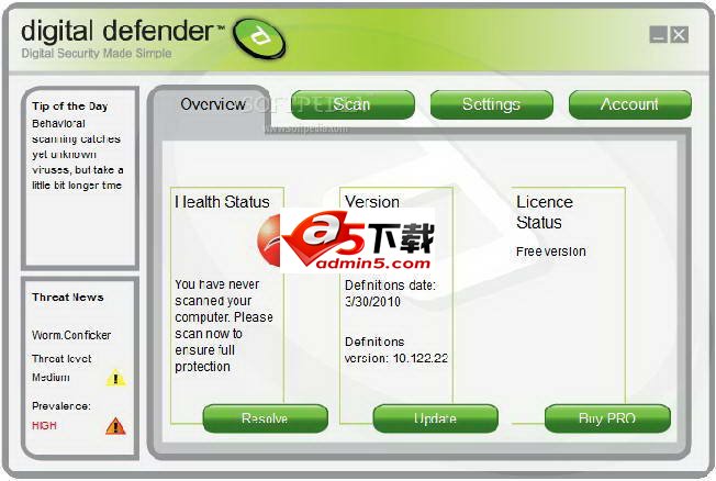digital defender是一个直接的防病毒应用程序,具有容易使用的界面,为初学者和有经验的用户设计的。使用增量的更新机制, 让下载时间减少到最低水平,使我们一天能够释放更多的病毒库包,以改善防护。用户可以获保护却不必花很长的时间,并产生大量的更新网络负载。