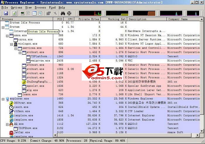 Process Explorer 是sysinternals作品,强大的系统进程查看器,特色之处之一就是可以显示一个程序调用了那些动态链接库DLL,这样可以发现一些十分隐蔽的木马!还可以查看这个进程的路径,以及公司,版本等详细信息,多色彩表示服务进程,系统进程,目录树方式查看进程之间的归属关系,还可以替换系统自带的任务管理器。