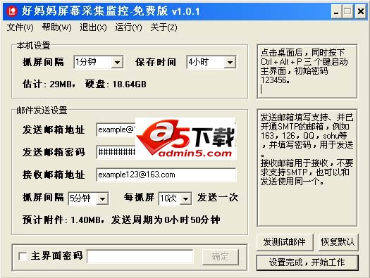 好妈妈电脑屏幕采集监控实现周期打印电脑屏幕,时间间隔支持从1秒到60分钟,保存成图片格式,本地电脑可保存14天的记录,动态计算所需硬盘空间,支持根据需求保存最近的记录(例如设置为48小时),删除老的记录,循环存储以节省空间。图片压缩,节省空间,24小时记录 只要100多M,而一般屏幕录像至少要几个G 的空间。软件支持定期将记录发送致指定电子邮箱。软件运行占用极少CPU和内存,对电脑的性能几乎没有任何影响,不同于大多屏幕录像软件消耗大量CPU和内存,导致电脑反应明显变慢,甚至鼠标和屏幕都闪个不停。