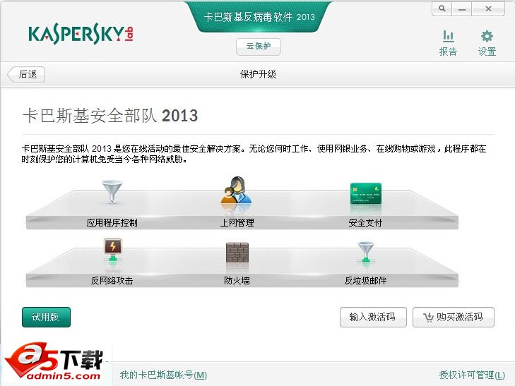 卡巴斯基反病毒软件2013是计算机安全系统的主心骨,提供防御最新恶意程序的核心、实时的保护。智能扫描、免疫更新,主动防御各种已知和新型的威胁。卡巴斯基反病毒软件2013是的核心保护不会拖沓计算机系统。