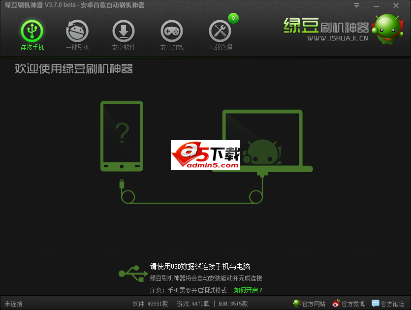 绿豆刷机神器电脑版(原“安卓驱动”,以下简称“绿豆电脑版”)——一款安卓平台上的自动刷机工具软件,支持多款主流安卓手机。只需在电脑上连接手机,即可自动刷机、自动备份/还原系统、自动获取ROOT权限、自动安装必备软件、下载软件游戏。