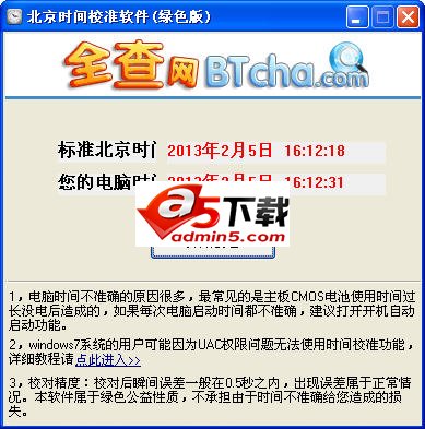 每台电脑上都有时间,但并不是每台电脑时间都是准确的,尤其是生活在东八区时间的我们。无数次电脑时间不准,打开,自己手工校对,然而,关机之后,又不是准确的时间了,情况很多,比如时间病毒,主板电池没电等。如何快速的与北京时间一键同步呢,全查北京时间校准器就是为专门解决此问题而来。