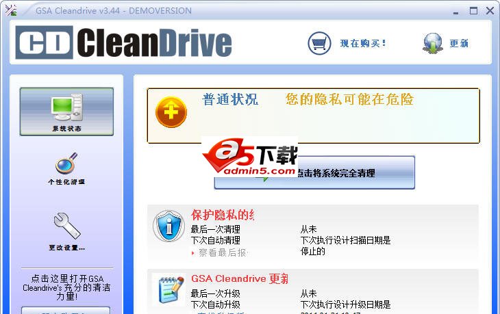 GSA Cleandrive 可以帮助您摆脱您大多数的保密性侵害。它删除所有互联网踪影(象您参观了) 的网站, 最近被打开的文件(象您的前个被演奏的录影文件) 甚至显示的日志什么节目您最近运行了(例如您开始了在办公室) 什么。