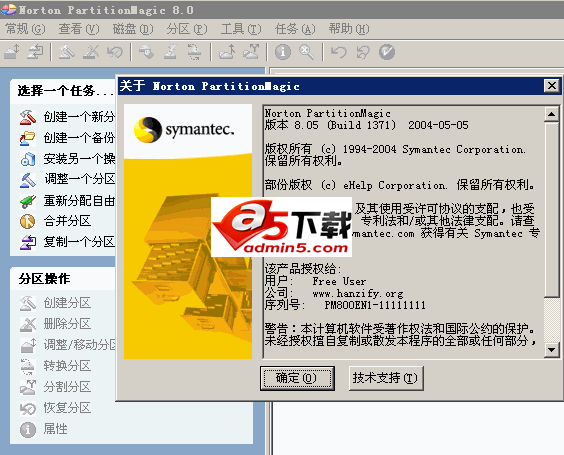 注册码PM800ENSP1-11111131 任务选择:创建一个新分区、创建一个备份分区、安装另一个操作系统、调整一个分区的容量、重新分配自由空间、合并分区、复制一个分区.
