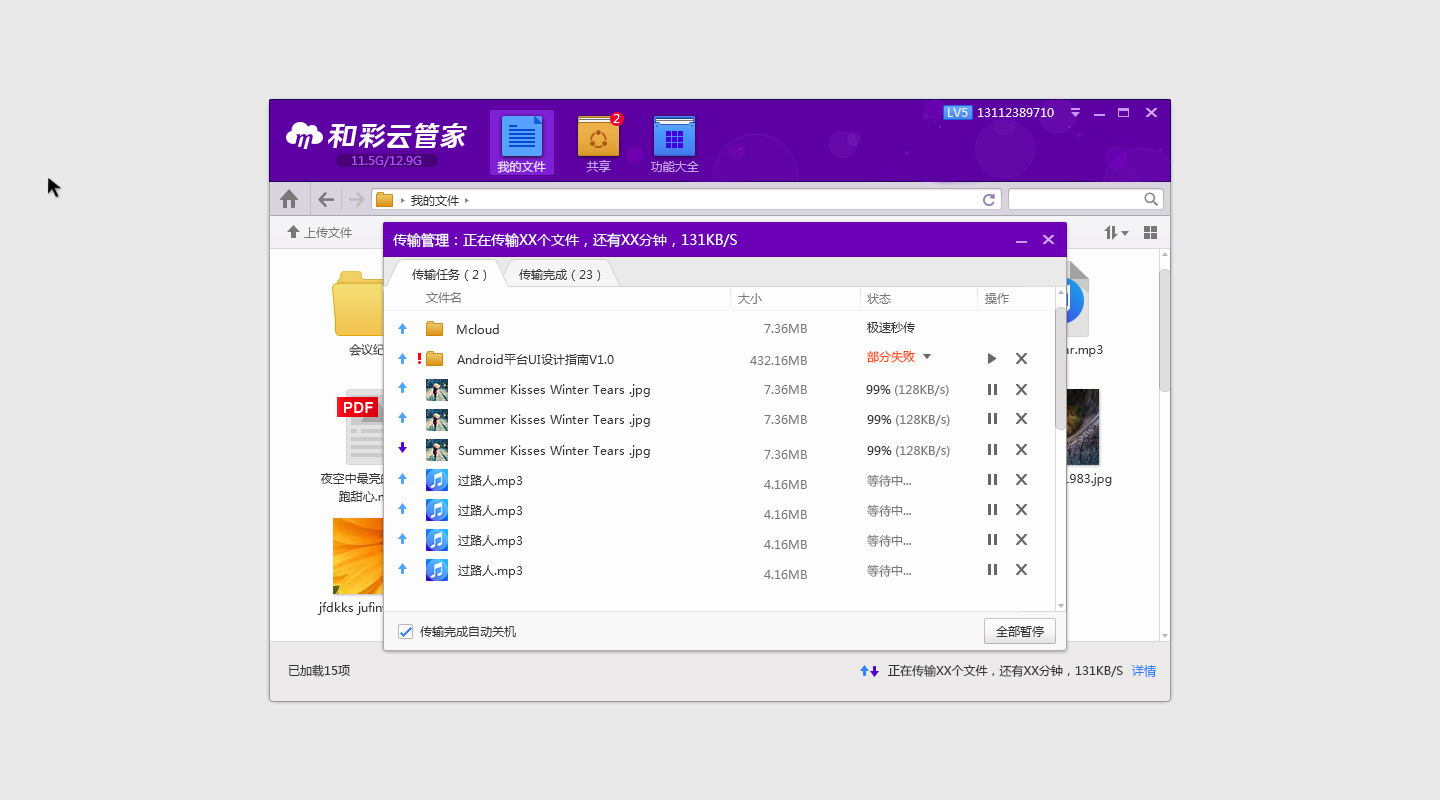 和彩云管家是中国移动公司推出的一款云服务产品,可备份储图片、音频、视频等各种文件,同时支持便捷地查看、上传、下载和彩云各端存储数据,另外可对这些文件进行共享(并有免费短信通知)、在线浏览(如图片在线浏览、视频在线播放)。使用和彩云管家上传、下载文件过程更稳定,不会因为浏览器、网络等突发问题中途中断,大文件传输更稳定。