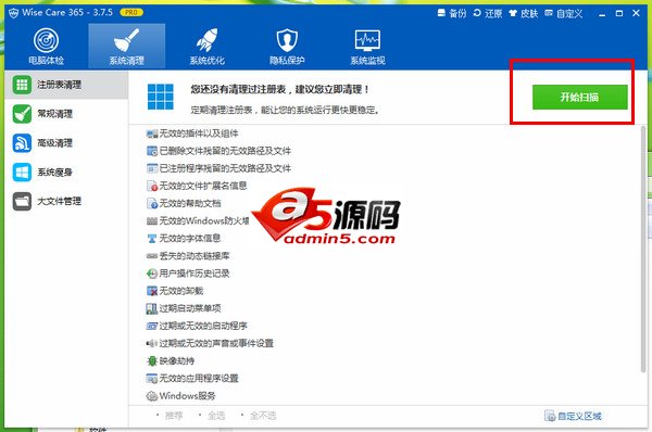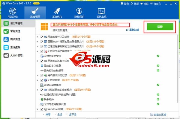 点击“系统清理”,注册表清理软件会快速的的扫描你的文件