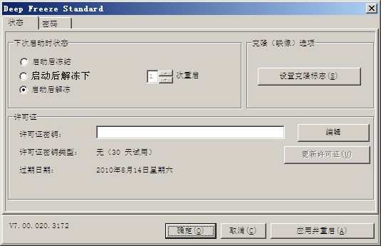 6、日常使用注意事项:切换“冻结”和“解冻”均需重启后生效,即:选择“冻结”后,本次关机时的状态将被保存,以后每次开机系统都将回复此纯净状态;但换回“解冻”后,关机前依然是冻结状态,需要重启后才能对系统作更改。