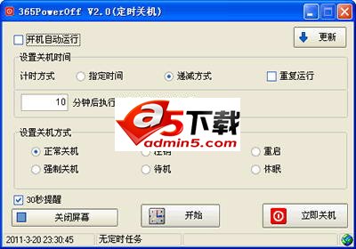 一款小巧的定时关机软件。支持6种系统关闭方式:关机、强制关机、重启、注销、休眠、挂起。支持立即关机或定时关机,定时关机支持倒计时或指定时间关机。本软件操作简单,与其他定时关机软件区别之处是该软件带有关机前提示功能,您可以在30秒内决定是否取消定时关机。同时,软件新增了关闭屏幕的功能,使用户可以睡前听歌,而免受屏幕发光的影响(特别是笔记本)。