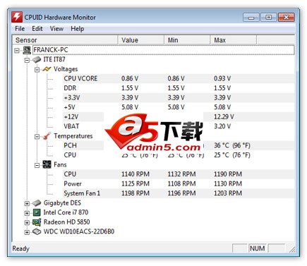 应该说这款软件对笔记本电脑来说非常的有用。虽说现在的笔记本电脑都有自动风扇控制系统,它可以自动的控制风扇的转速和时间,从而达到控制温度的作用。不过这也不是100%可靠的,尤其是你的笔记本连接了很多外部设备的情况下。那这时HWMonitor就可以发挥它的作用了。通过它你可以实时查看到硬件的最真实情况,