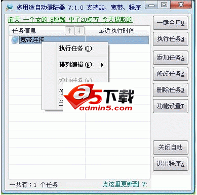 宽带QQ批量自动登陆器是一款比较人性化、自动化、实用化全能的控制登陆器,能控制任务是否显示与关闭,主程序关闭也不用担心,可以继续打开主程序控制在线的任务。目前支持强大的宽带自动拨号、QQ号批量快捷自动登陆、程序自动登陆,支持密码控制,老板键控制,执行任务控制等全操作。