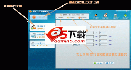 天艾达定时关机软件有两种不同的自动关机任务模式可选择, 在简单模式里你可以设置"在指定时间点关机", "从现在起多长时间后关机", "从开机起多长时间后关机" 及 "无鼠标键盘输入 在计划关机模式里你可以对一个星期里,从星期一到星期天的每一天设置五个不同的关机时间, 该自动关机软件随开机启动后自动检测, 如果在你设置的关机时间范围内就会自动关机. 你可以同时选择多个关机条件, 这时该定时关机软件就会在最先到达的条件时间点上自动关机. 这是多完美的组合!