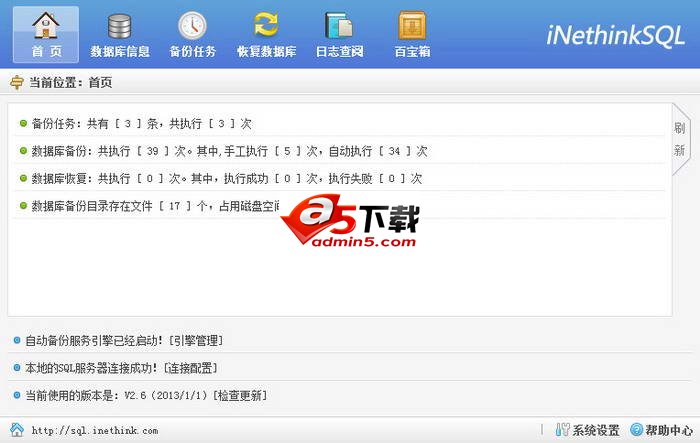 SQL数据库备份恢复助手,完全免费、纯“绿色化”、无需安装、操作便捷,完美支持本地/局域网(远程)数据库自动/手动备份。可自由组合的无限复合式备份任务,支持备份文件ZIP压缩后通过Lan/Ftp/云(金山快盘)/Email传输存储,Email日志信息发送,自由删除指定周期与存储位置的备份文件,还具有安全可靠的SQL数据库恢复功能。