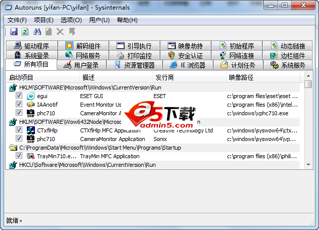 AutoRuns是一款专业好用的启动项目管理工具,由Sysinternals公司开发。软件不仅可以对各启动项目进行管理,还能直接控制注册表,此外软件可以直接利用google和MSN进行网上搜索。它也可以直接管理不同的登陆帐户,随时把操作的记录保存为文件。Autoruns作为Sysinternals Suite(故障诊断工具套装)的一部分,可运行于 Windows XP、Windows Server 2003 和更高版本的 Windows 操作系统。该软件还包括一个相同功能的命令行版本Autorunsc,可以把结果报表以 CSV 格式输出。