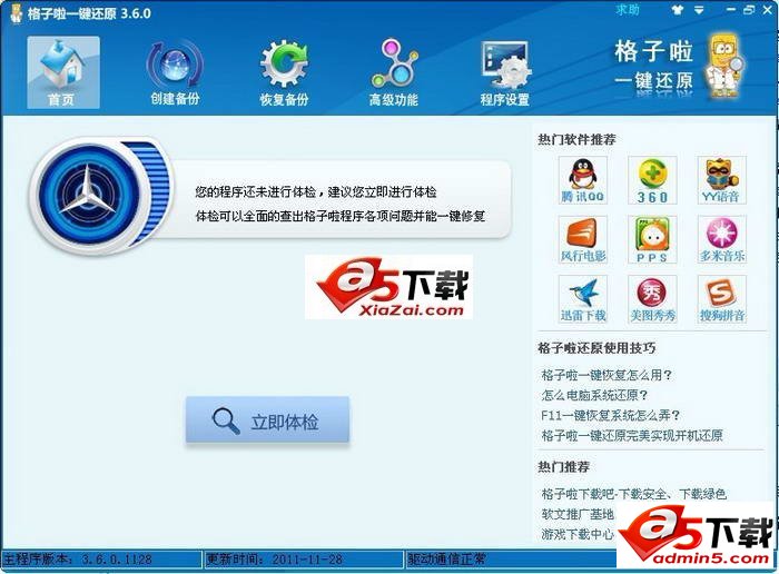 格子啦一键还原性能稳定,只在备份和还原是启动软件,不影响你的工作。格子啦一键还原全面支持win7、windowsXP、vista、2000、2003、2008等系统,支持多硬盘、多分区备份。