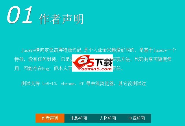 全页面横向定位滚屏是一款基于jquery实现的鼠标响应式横向定位滚屏特效代码。