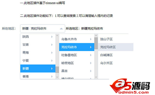 ElementUI三级联动菜单代码,省市区三级联动代码,功能如下:1.可以查询搜索;2.可以清楚输入框内的记录。