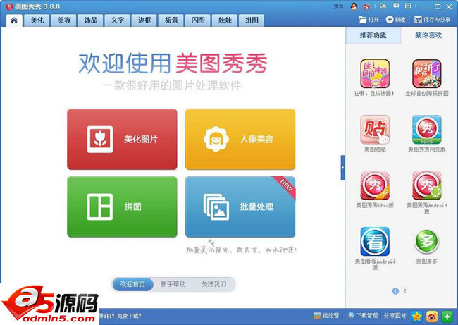 美图秀秀是一款很好用的免费图片处理软件,不用学习就会用。美图秀秀独有的图片特效、美容、拼图、场景、边框、饰品等功能,加上每天更新的精选素材,可以让你1分钟做出影楼级照片,还能一键分享到新浪微博、人人网……在各大软件站图片类高居榜首的美图秀秀,目前已有1.2亿人正在使用,赶快下载安装吧!