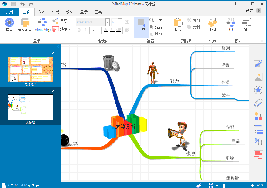iMindMap是一款带有一些严肃风格的思维导图软件。第一印象是最重要的,它决定了你从看到的事物中捕捉兴趣,并促使大脑的创意的齿轮开始转动。这就是为什么iMindMap确保你需要每一个格式和绘图工具都在你的指尖,让你的想法熠熠生辉。