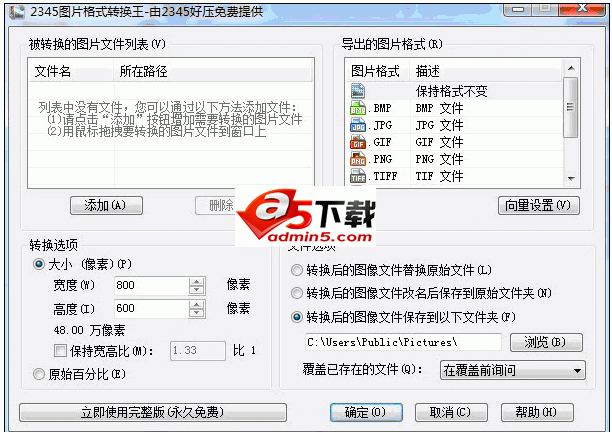 软件简介: 2345图片格式转换王 V2.8提供多种图片的压缩裁剪转换功能。目前支持图片转换的格式有:BMP JPG GIF PNG CUR TIF TGA PCX WBMP WMF JP2 JPC PGX RAW SKA。支持导出的图片格式有:BMP JPG GIF PNG TIFF TGA PCX PNM 。