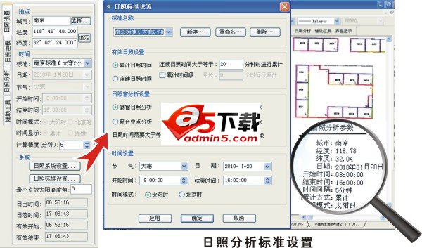 标准灵活:轻松设定日照标准,预设主要城市标准模版,选择城市名称自动获取经纬度,从结果标注可反查计算标准。
