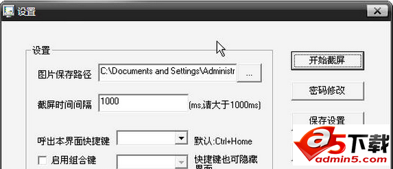 3.可用快捷键随时调出控制界面,进行参数的设定,参数包括图片保存路径,截屏时间间隔,快捷键,密码修改等;
