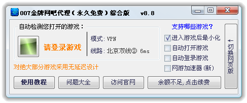 007金牌网吧代理是一款国内最智能、最方便、最稳定的金牌网吧代理与网游加速器结合一体的代理产品!