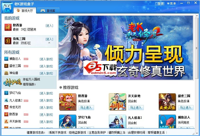 老K游戏盒提供海量的网页游戏、棋牌游戏、单机游戏、下载、充值、试玩等娱乐功能服务;通过老K游戏盒子可轻松登录老K页游推出的数十款热门网页游戏,且无需区记录和收藏游戏服务器地址,若是钟爱中国传统棋牌游戏,也可通过老K游戏盒子在线下载试玩,体验斗地主、射龙门、血战麻将等经典传统棋牌。所有提供的游戏资源,经由老K游戏专业开发评测团队开发及选择,致力于为各位玩家爱提供更丰富、更便捷、更轻松的游戏环境,为您的游戏生活添加新的光彩。