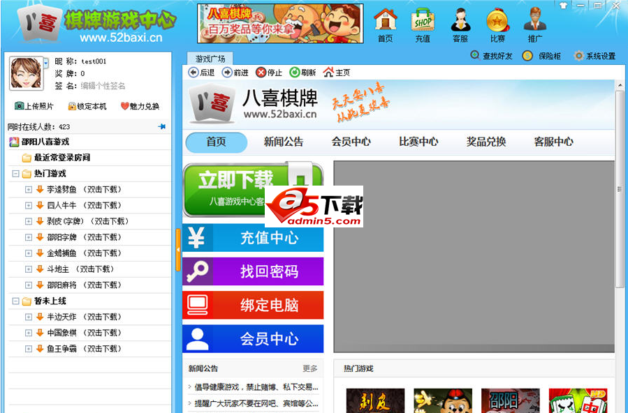 八喜游戏大厅是针对跑胡子,字牌,剥皮,捕鱼开发的棋牌和交友类游戏的平台。游戏中使用的“货币”是游戏币与八喜币,可以用来买游戏道具:双倍积分卡、护身符、小喇叭等等。八喜游戏除部分小游戏外,大部分游戏都需要安装后才能进行游戏。每次游戏后赢了就会获得相应的积分,积分到达一定限度时就可以升级了。每个游戏的升级标准都不同。