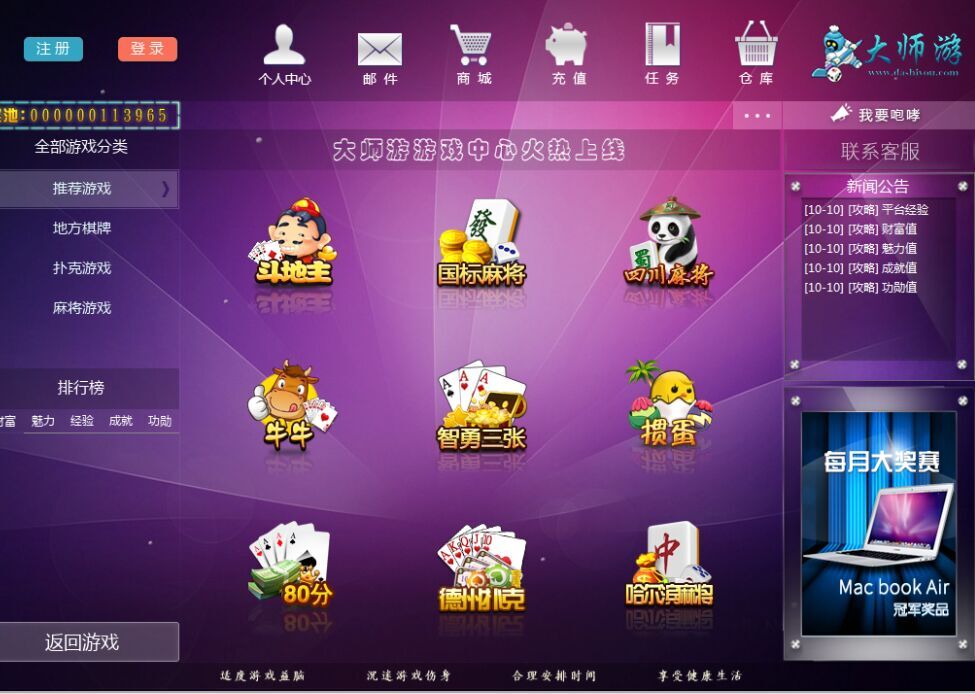 大师游游戏中心是由武汉拇指通科技有限公司自主研发的一款社交、竞技、休闲与一体的多功能棋牌游戏平台,他集互动道具炫酷特效,千人同场竞技,新概念防作弊分桌,任务系统,公会系统等于一身,为广大棋牌爱好者提供了一个全新概念的棋牌游戏平台。他们所提供的游戏如斗地主、血流成河、卡五星、掼蛋、国际麻将、够级等游戏,都是当前最为流行的或是具有地方特色的棋牌游戏,可以迎合广大棋牌爱好者的体验需求。