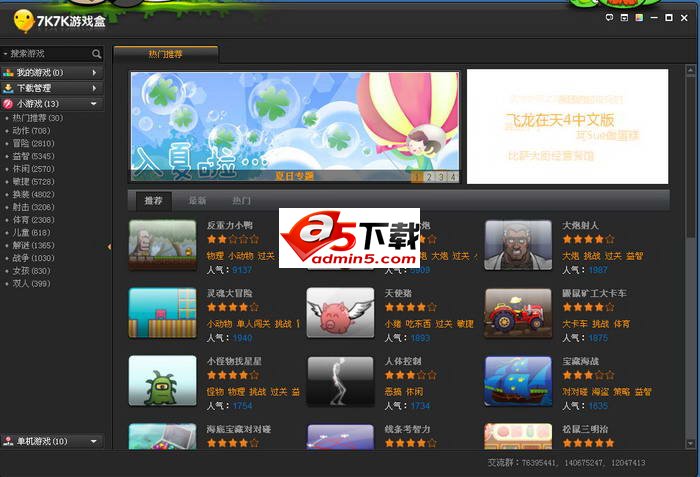 7K7K游戏大厅是一款完全免费的游戏客户端软件,为7K7K游戏盒升级版。不花一分钱,可自由玩遍各类游戏。单机,小游戏,网游,页游任君挑选。区别于一般的在线小游戏网站,高速的游戏下载后,不用连网也可进行游戏,给您更加完美的游戏体验。