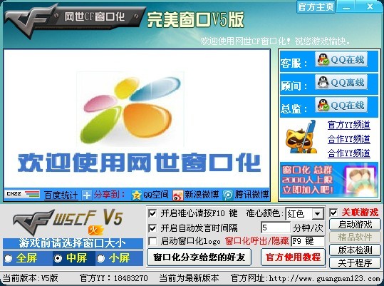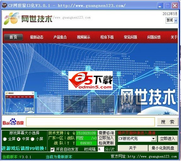 网世CF窗口化3.0.1 更新介绍 1.修复全屏游戏鼠标切换出错的异常! 2.支持托盘图标显示~! 3.支持自动发言的功能 4.支持版本自动更新功能 5.支持快速搜索页面功能 可设游戏屏幕大小,支持全屏中屏小屏 三种模式. 切换游戏请按F9. 有任何其它的问题,请Q:1510028109 进行反馈.
