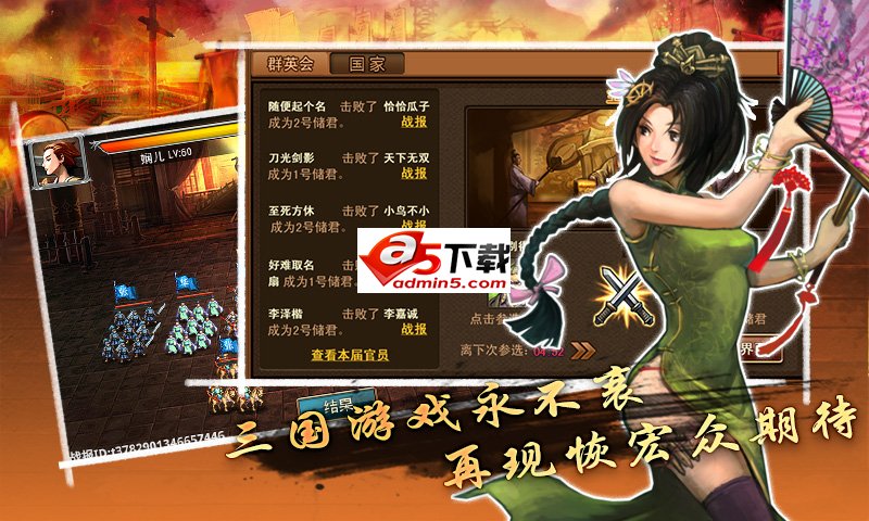 三国游戏永不衰,再现恢宏众期待.2012年最受期待的精品手游《三国志风云》,这款集国战团战,剧情关卡,武将养成等诸多玩法于一身的游戏,将中国三国策略(SLG)手游提升到一个新的高度.玩家在游戏中,不仅可以享受武将搭配和阵型变化的乐趣,也可体验剧情通关的快感,更能与数千玩家同战沙场.