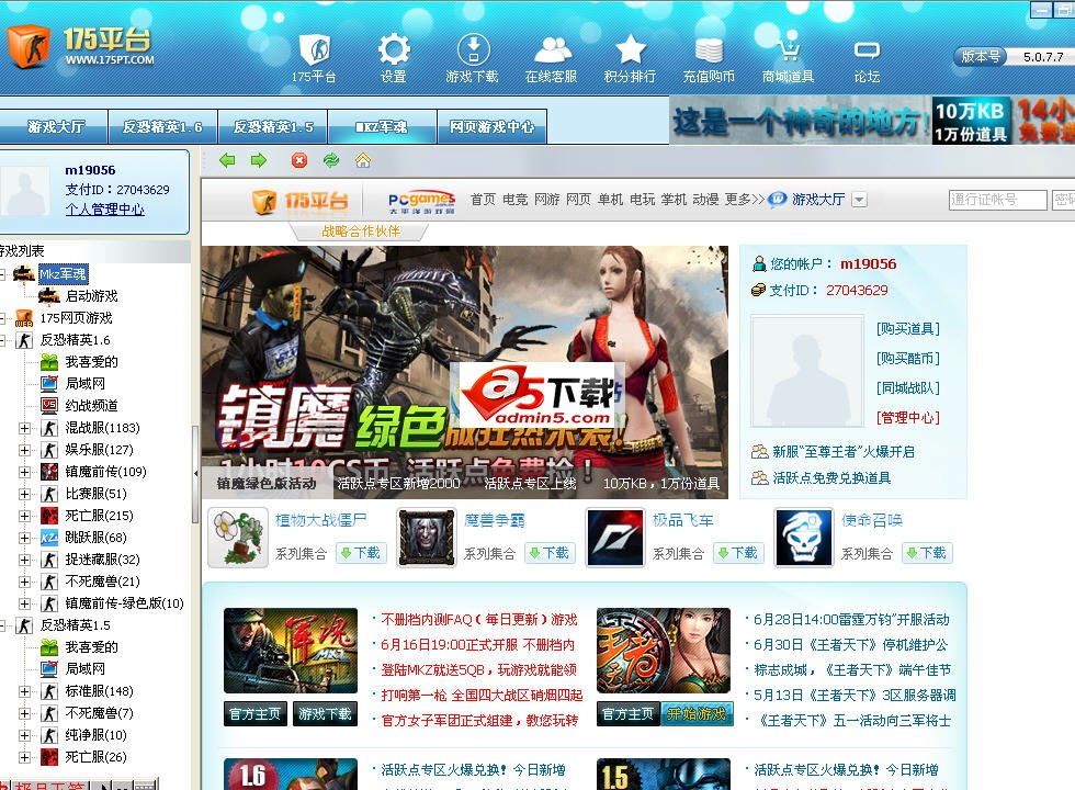 175平台(175平台下载)目前主要运营广受欢迎的FPS游戏CS系列,是国内最大的CS游戏对战平台。未来我们还将引入更多的竞技类网游。  175平台(一起玩平台)是以各种竞技类游戏和"175主题网吧联合运营简称175吧为核心的娱乐竞技平台,我们通过创新的策划组织各种活动和娱乐赛事来吸引玩家加入到一起玩平台来。涉足的游戏主要是以竞技类,适合比赛的游戏为主,例如CS1.6、CS1.5等。