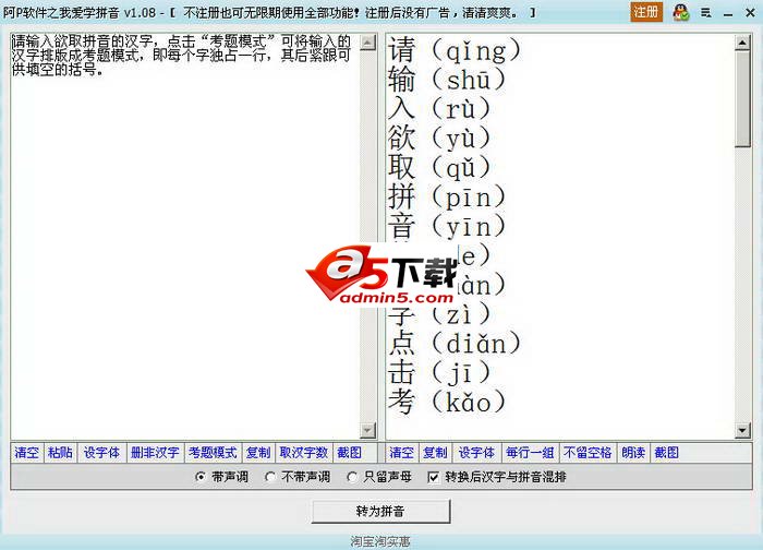 输入汉字,输出拼音。转换后的拼音可选择“带声调”、“不带声调”或者“只留声母”。程序主体为两个编辑框,用户在左方“汉字编辑框”输入汉字后,点击“转为拼音”按钮可将相应拼音显示于程序右方“拼音编辑框”内。转换结果默认为汉字与拼音混排,用户亦可选择只显示拼音。汉字与拼音混排时用户点击相应按钮可将显示结果排版成每行一组,即每个汉字独占一行,其后紧跟与其对应的拼音。用户点击“汉字编辑框”的相应按钮可将输入的汉字排版成“考题”模式,即每个字独占一行,其后紧跟可供填空的括号,方便打印出题等。更多功能敬请下载试用,完全免费。