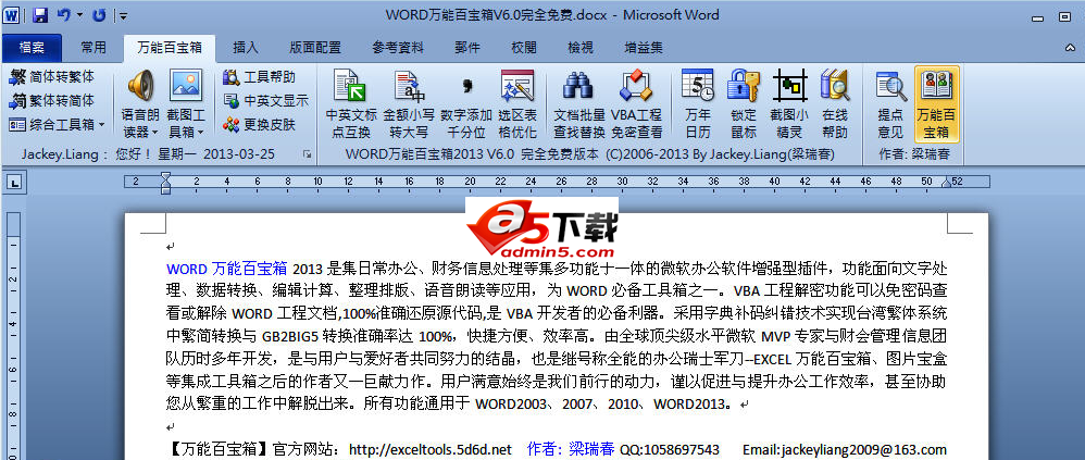 WORD万能百宝箱2014是集日常办公、财务信息处理等集多功能于一体的微软办公软件增强型插件,功能面向文字处理、数据转换、编辑计算、整理排版、语音朗读等应用,为WORD必备工具箱之一。VBA工程解密功能可以免密码查看或解除WORD工程文档,100%准确还原源代码,是VBA开发者的必备利器。采用字典补码纠错技术实现台湾繁体系统中繁简转换与GB2BIG5转换准确率达100%,快捷方便、效率高。由全球顶尖级水平微软MVP专家与财会管理信息团队历时多年开发,是与用户与爱好者共同努力的结晶,也是继号称全能的办公瑞士军刀--EXCEL万能百宝箱、图片宝盒等集成工具箱之后的作者又一巨献力作。用户满意始终是我们前行的动力,谨以促进与提升办公工作效率,甚至协助您从繁重的工作中解脱出来。所有功能通用于WORD2003、2007、2010、2013。首版本为完全免费,100%开放全部功能,且无限期使用。
