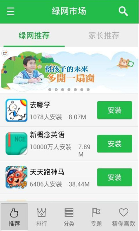 1、绿色市场:精准推荐一些孩子实用的软件,加强孩子与家长的互动。家长可推荐一些应用软件给自己的孩子使用。 2、绿网浏览器:通过绿网浏览器可以拦截不良网址,也可以自定义黑名单网址等。