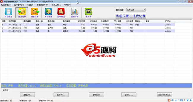 2、进销记录:对进销商品的数量、金额进行添加、修改、删除、查询。