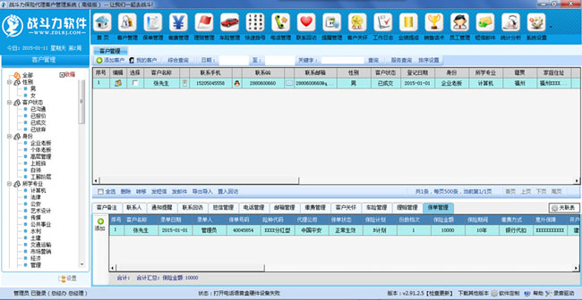 战斗力保险代理客户管理系统是一套专门为保险代理人设计的客户管理软件,可轻松实现科学高效的客户管理和保单管理、缴费管理、理赔管理、车险管理等。