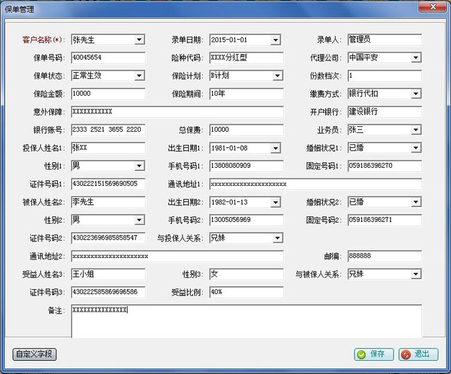 2:保单管理:客户名称这里可以快速的添加和搜索并保存联系人、其它包括投保人、受益人、保单号码、险种代码、开户银行、银行账号、总保费、业务员等等。