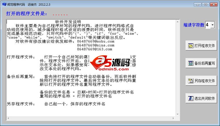 规范程序代码主要是为自己程序所写的程序代码,进行程序代码格式自动规范使用的,减少编程时格式设定的浪费的时间,软件现在只是完成基本规范功能,只对代码中的{、}、if、for、else、case、while、 switch、default等关键词做出反应。