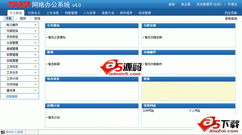 78OA办公系统v4包括了电子邮件、即时通信、手机短信、公告管理、新闻管理、投票管理、日程管理、工作计划、文件存储、通讯簿、办公用品管理、固定资产管理、图书管理、会议管理、车辆管理、工作流程、档案管理、人力资源管理、培训管理、财务借销管理、超级论坛、网络会议、附件程序、系统设置管理等二十几类办公管理功能,集成了包括手写签章、电子表单、自定义流程设计在内的196个功能模块,覆盖企业管理90%以上的网络办公事务,是适合所有行业企事业单位的网络办公系统。